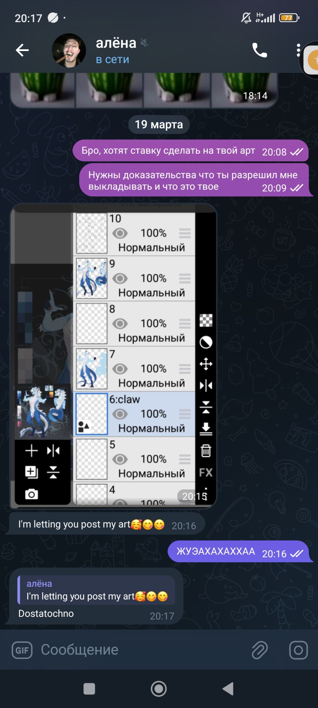 Hm...I do not know if the screen has been sent to you. I don't see him, but if he hasn't gone, you can write to me on telegram.I asked my friend to drop off the proof that it was her art. He also asked for permission.