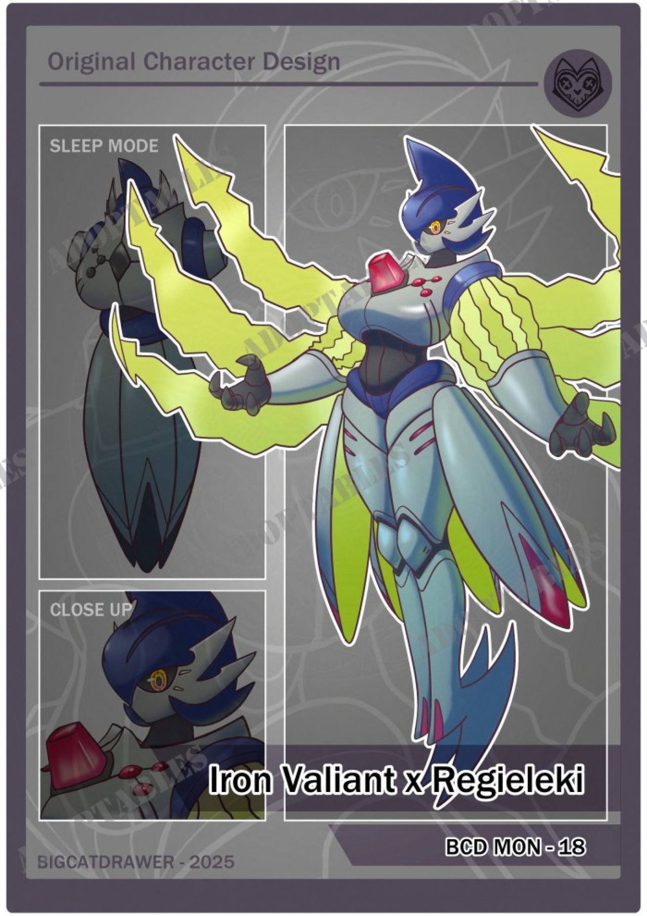 ok that is a very nicely done character design. I am not a fan of regileki but you implemented their features with iron valiant beautifully. I don't need more characters, but this is a very nicely done adopt design.